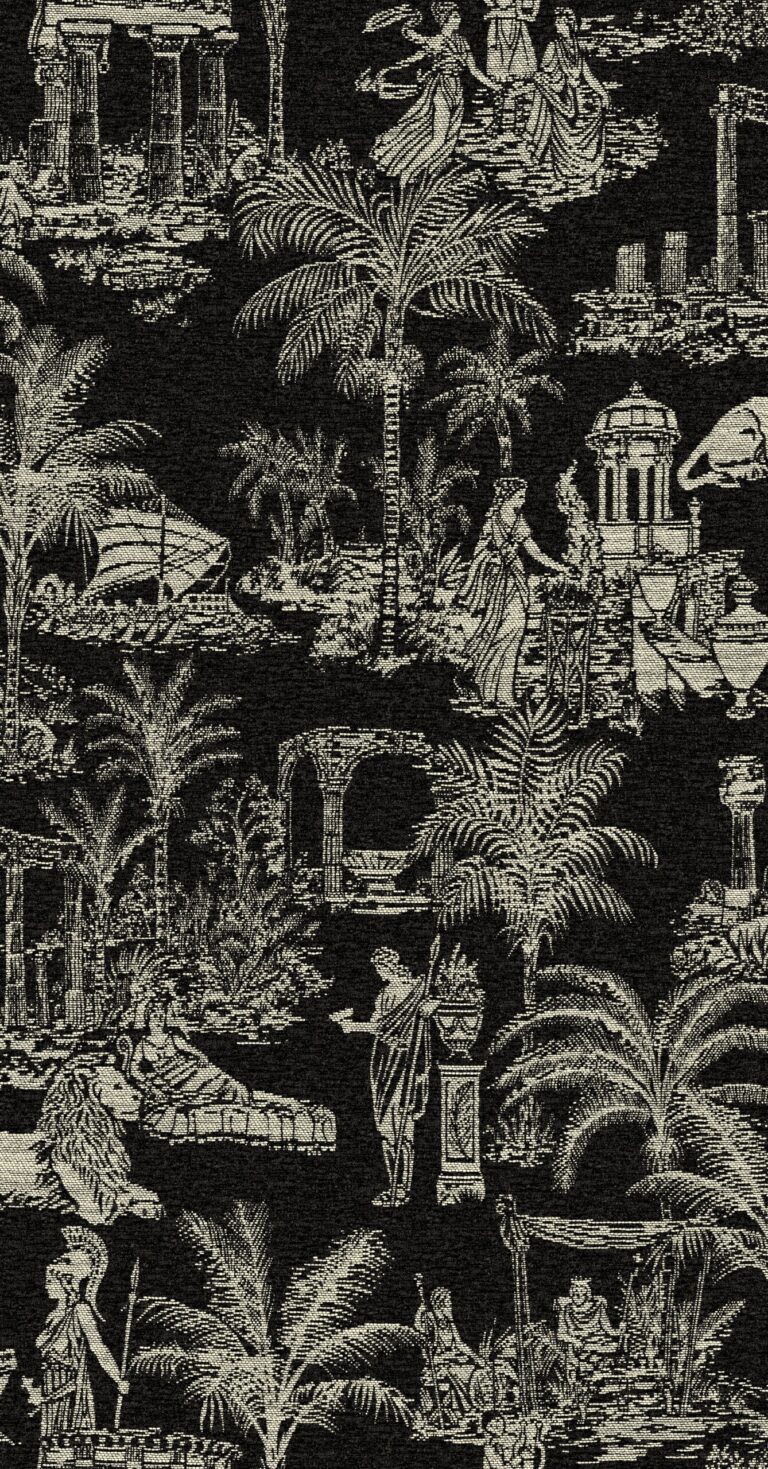 Deze niet-alledaagse muurbekleding in geweven jute neemt je mee naar het rijkelijke verleden van de Grieken met statige tempels en ondoorgrondelijke mythes. De monochrome tekening is geïnspireerd op de bekende, romantische stijl van toile de Jouy.