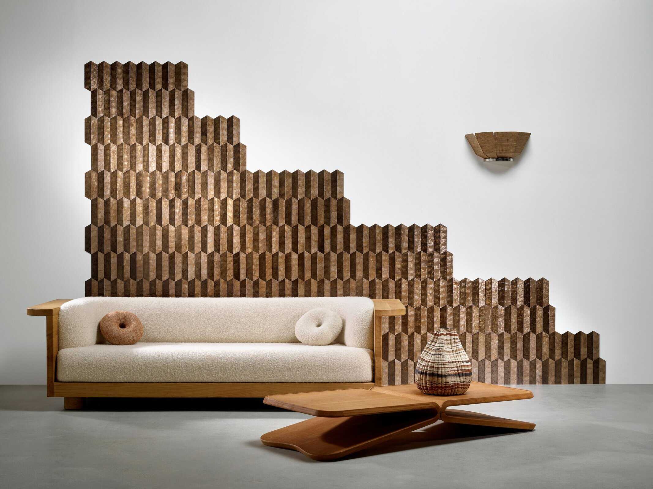 Echte schelpen in een geometrisch patroon waarbij de kleurnuances van het parelmoer variëren naargelang de lichtinval. Samal is een eiland in de Filipijnen waar capiz gewonnen wordt. Deze oesterachtige schelpen worden handmatig gekleurd, versneden en in geometrische patronen ingelegd. Capiz is een echt natuurproduct; elke schelp is uniek en verschilt in kleur en structuur. Dit maakt van deze collectie een exclusieve en artistieke muurbekleding. Bovendien variëren de kleurnuances van het parelmoer naargelang de lichtinval waardoor een verrassend en voortdurend veranderend effect ontstaat.