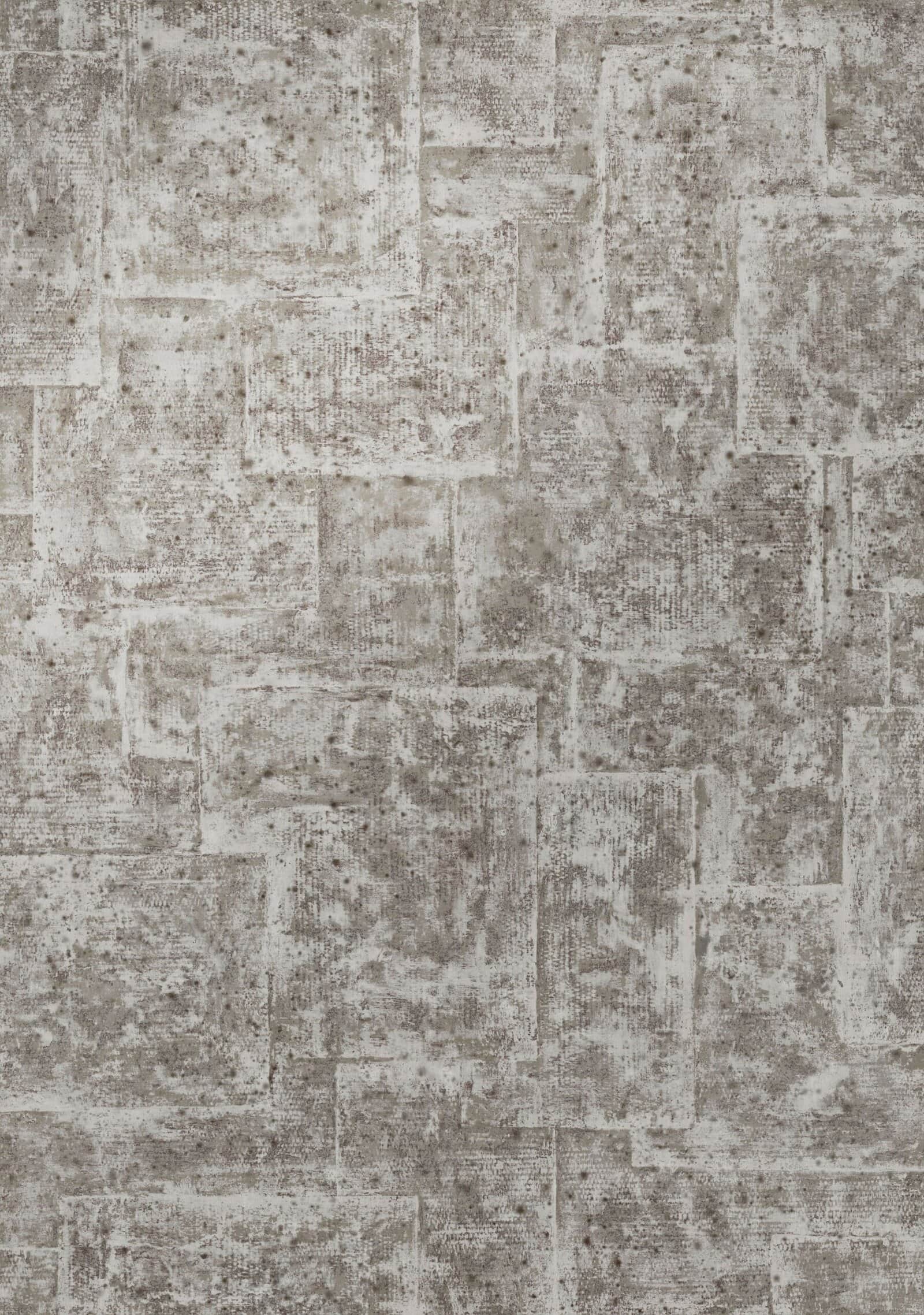 De inspiratie voor dit dessin vonden we bij antieke quilts, die vaak een willekeurig patchwork als bovenlaag hebben. Het patroon toont een patchwork van stukjes textiel geprint op metaalfolie, bedekt met een dun laagje pleister waar de stof doorheen schemert.