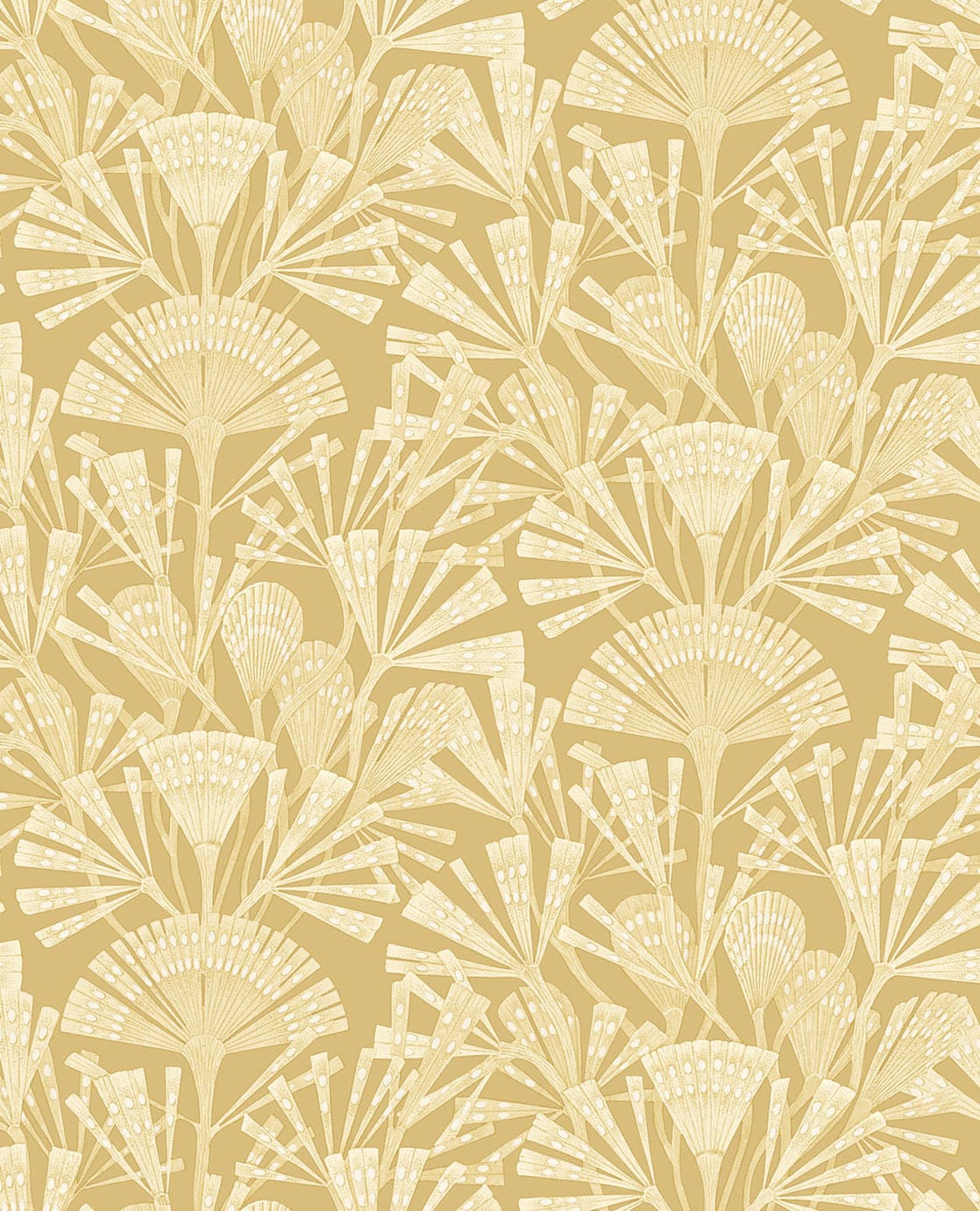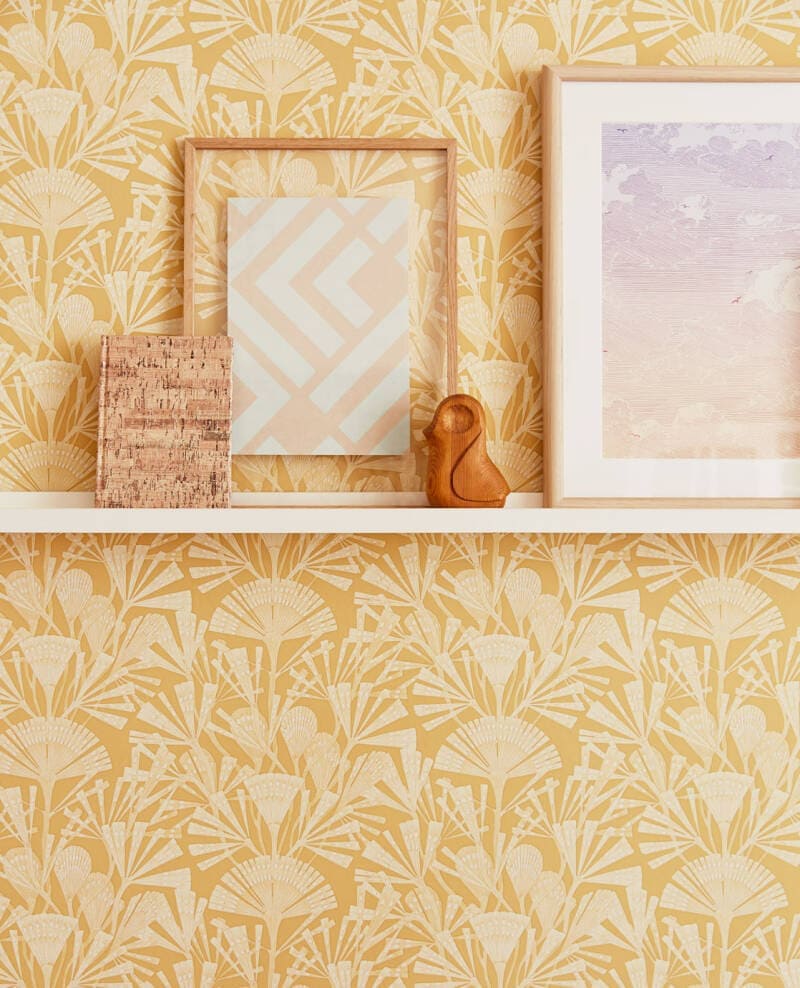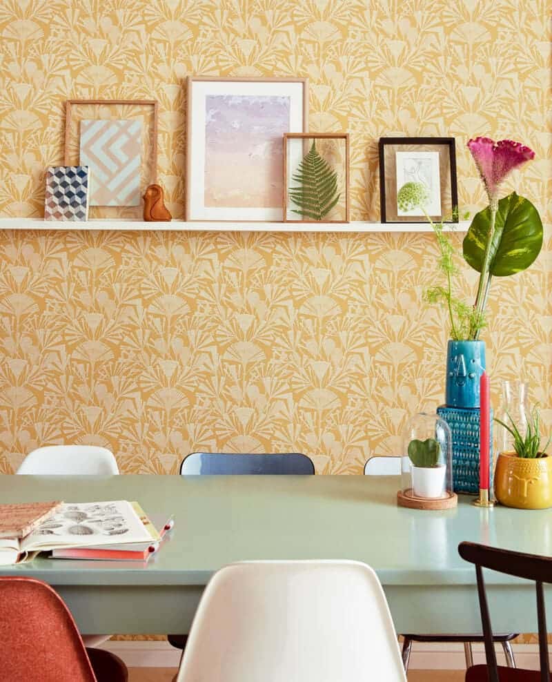 Het atelier is een geordende chaos. Het ochtendlicht strijkt over rollen boekbinderslinnen en vellen geschept papier. De zon vonkt in bronzen stempels, passers en linialen. Een fossiel rust als presse-papier op een antiek herbarium. Gravures en botanische tekeningen sieren de wanden. Kroontjespennen, Oost-Indische inkt en krijt liggen klaar op de tekentafel om de wonderen van de natuur mee te vangen. De kunstenaar stapt binnen, de dag begint. Het huis is licht en warm. Natuurlijke materialen zoals kurk vormen, een rustige achtergrond voor vintage meubels, zorgvuldig uitgelicht door opvallende lampen. Grote planten met opvallende bladstructuren geven sfeer. Decoratieve vazen zijn gevuld met waaiervormige bloemen en wuivende grassen. Open kasten tonen een persoonlijke collectie kunstboeken. Het gastvrije huis nodigt uit tot introspectie en creatie. De collectie Geonature knipoogt naar de periode van de art deco met gestileerde motieven, grafische lijnen en gedempte tinten. De symmetrie uit de natuur is gevangen in stoere en subtiele geometrische dessins. De reliëfs zijn subtiel als bladnerven. De wanden krijgen kleuren als wolkenwit, zandgeel, zeegroen en mistig blauw of zwart met een glimpje zonnegoud. Een natuurlijke metamorfose voor je huis.