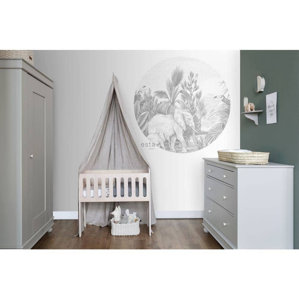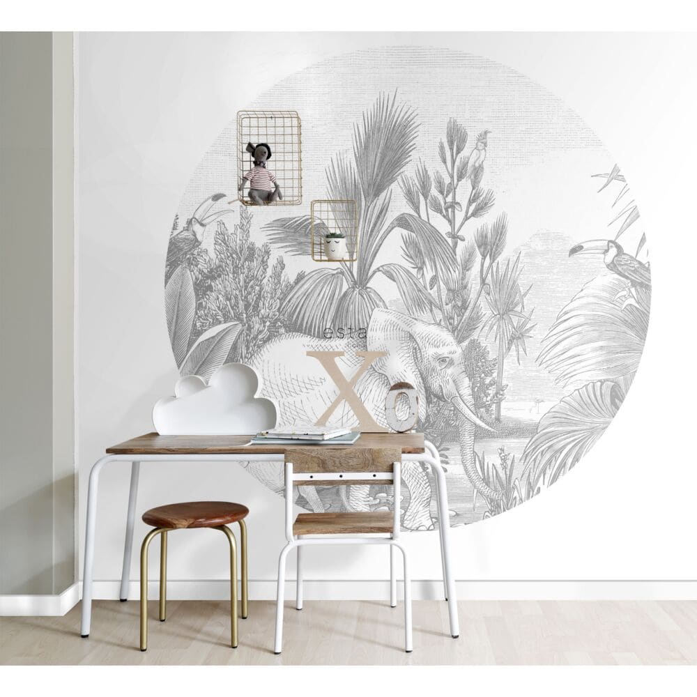 Geef de kinderkamer avontuurlijke flair met een junglegevoel via jungle behang. De botanische lijnen en legertinten passen ook naadloos in botanisch interieur of een speels dierenverhaal met dierenbehang.