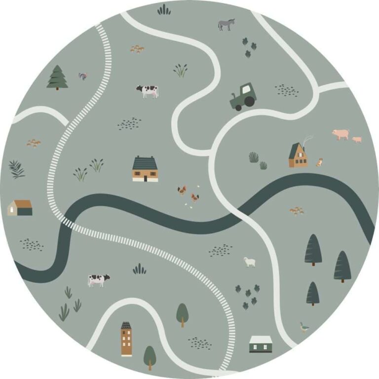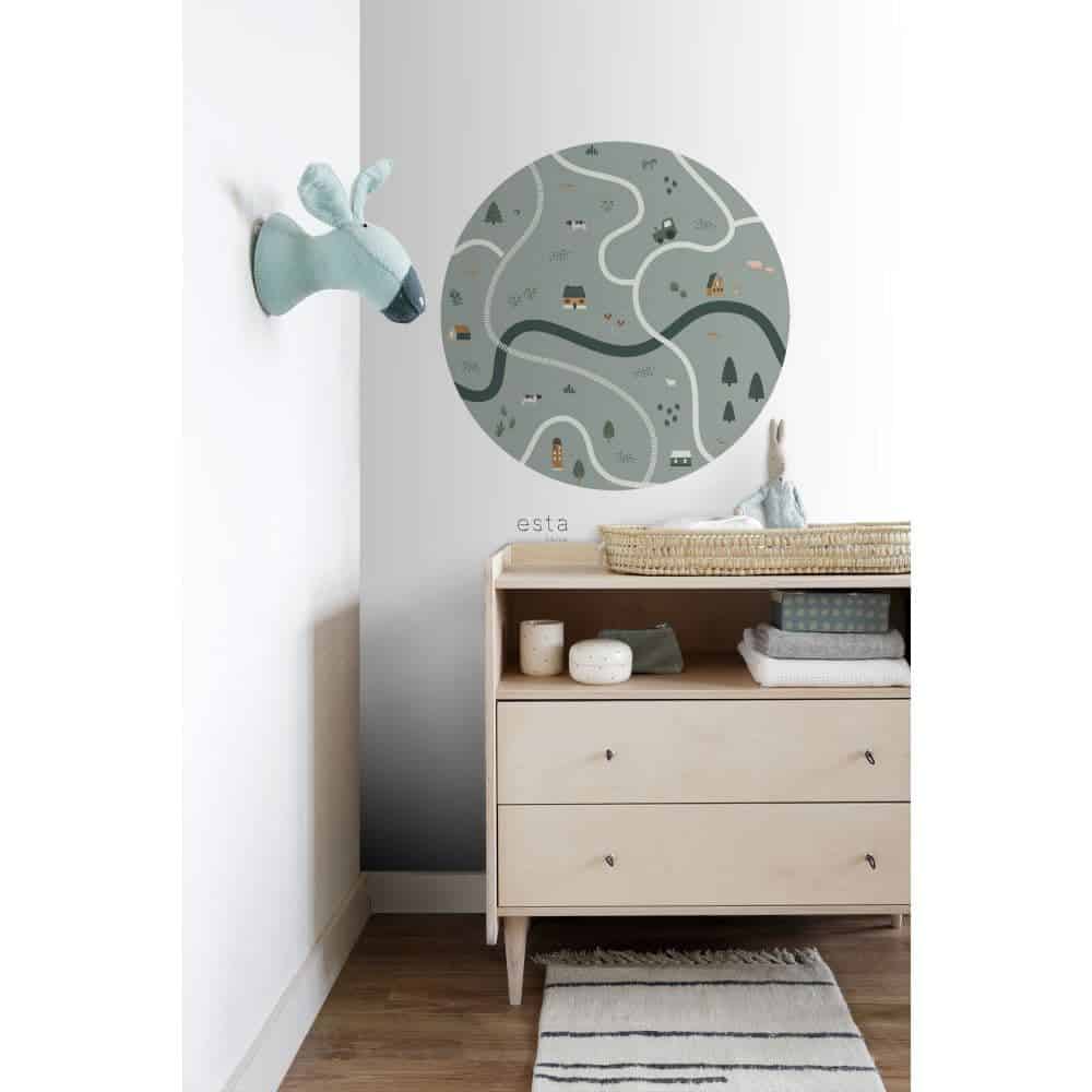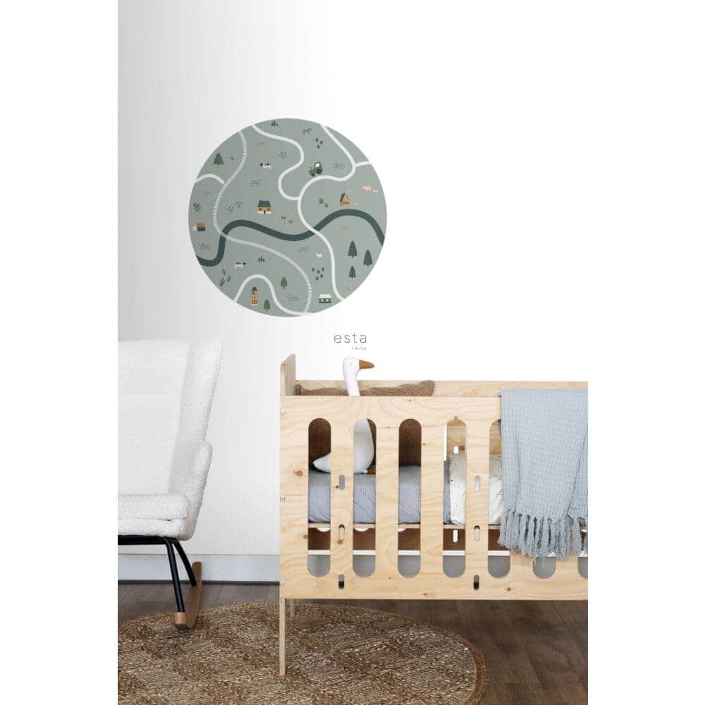 De kinderkamer is dé plek om eindeloos lekker te kunnen spelen, te fantaseren en de mooiste dromen te dromen. Met deze zelfklevende Esta  Home Behangcirkel met tractoren en boerderijdieren in vergrijsd groen tover je elke kamer om tot een gezellige kinderkamer.